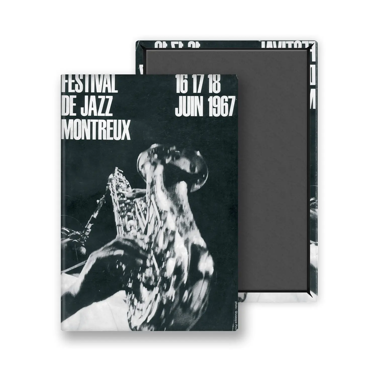 Ce magnet fait partie de la gamme Giuseppe Pino. Ce n’est pas une affiche. Du moins pas une affiche originale. La première édition du Festival n’avait pas pu se payer une grande campagne de communication avec son maigre budget initial. La photographie de couverture du programme s’est muée en poster de cette édition. L’image en contreplongée représente le saxophoniste Charles Lloyd, l’invité de marque de 1967. Elle est signée Guiseppe Pino.