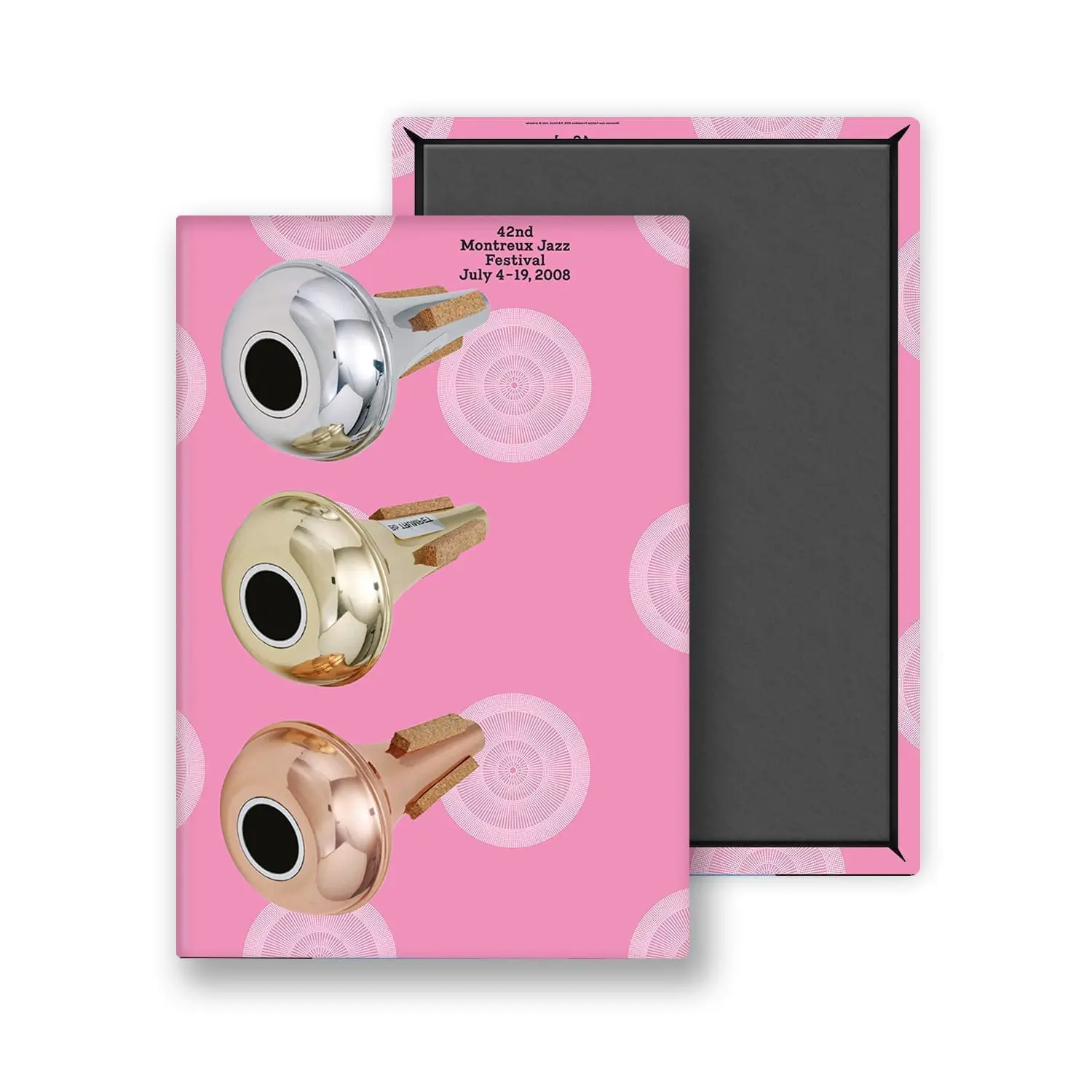 This magnet is part of the John M Armleder collection. Once again, an international star of contemporary art is given carte blanche to design the Festival’s poster. The Geneva artist John M Armleder combines a graphic composition of kinetic wallpaper-like motifs with a photo of three trumpet mutes.