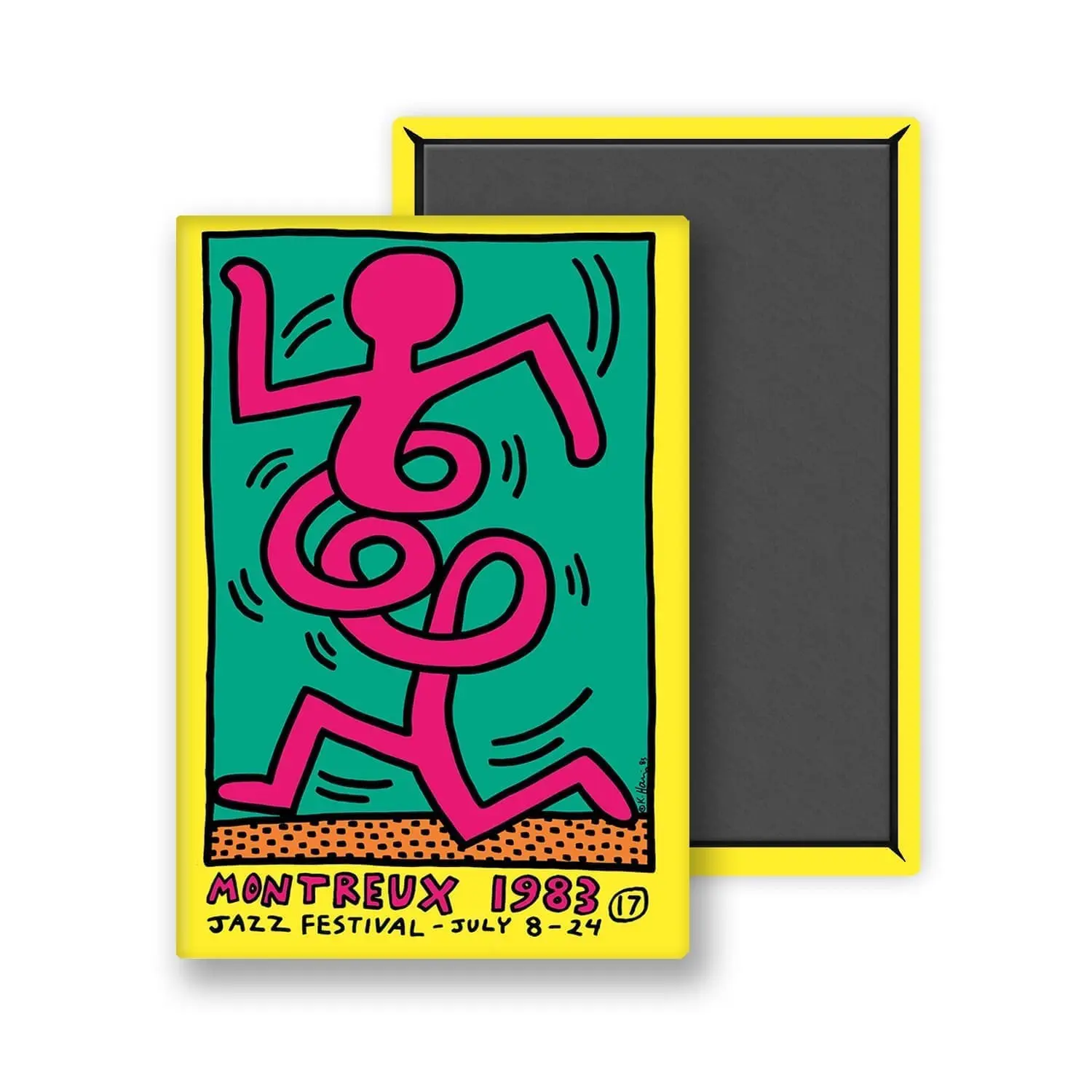 This magnet is part of the Keith Haring collection. The first official exhibition of Keith Haring’s work was held in 1982 at the Tony Shafrazi Gallery in New York, and was hugely successful. Pierre Keller met Haring a few months later and asked him to produce a Festival poster featuring a dancing figure. Haring came up with three designs, all of which were accepted. Keller and Nobs had the brainwave of inviting the New York artist to Montreux. As always, Haring painted constantly, producing murals on large blank panels on stage with the musicians and in the streets of Montreux.