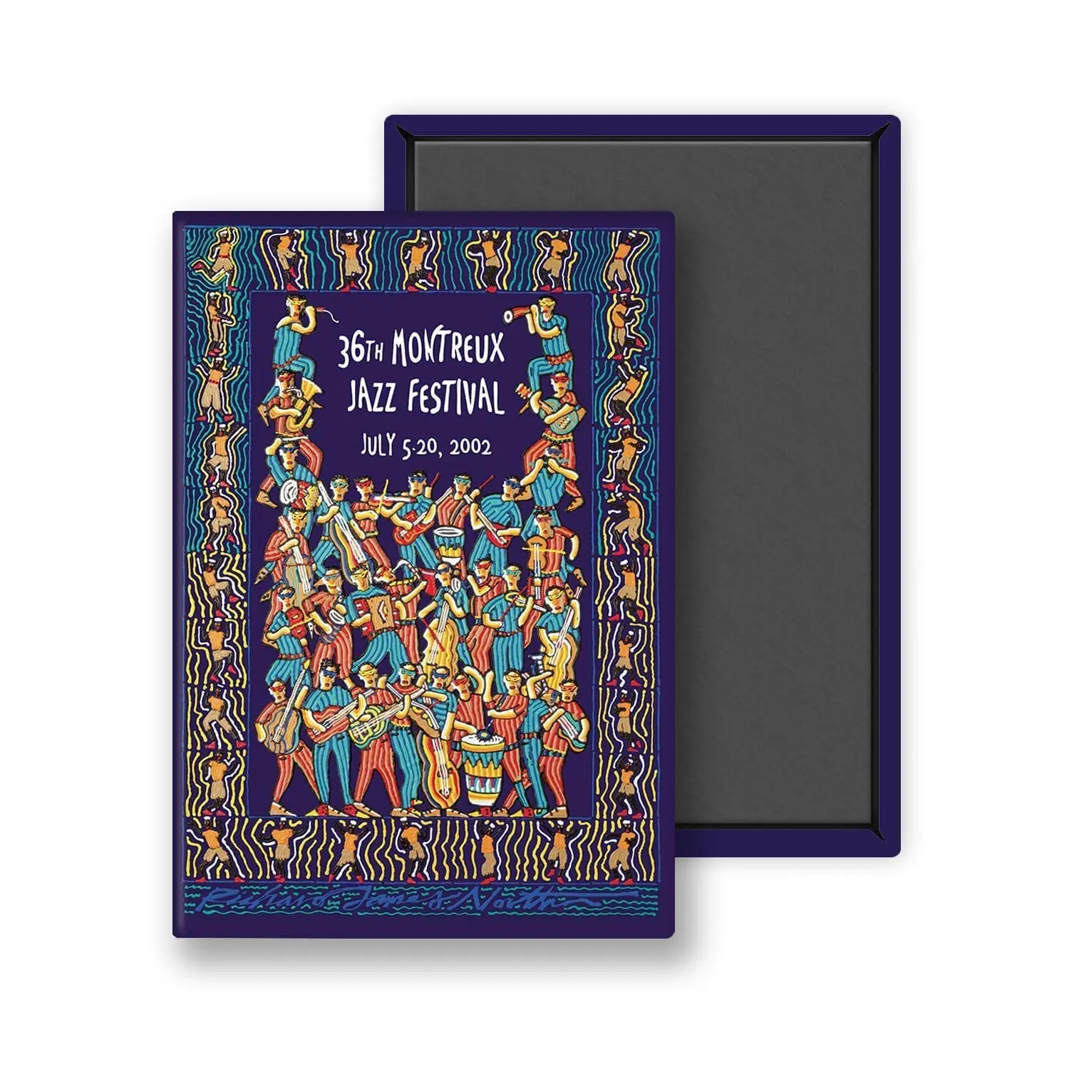 This magnet is part of the Richard James North collection. He is a 53-year-old English painter exiled to Mykonos. For the Montreux Jazz, he represents musicians streaked with tones on tones who are framed by a frieze of dancing and exulting audiences.