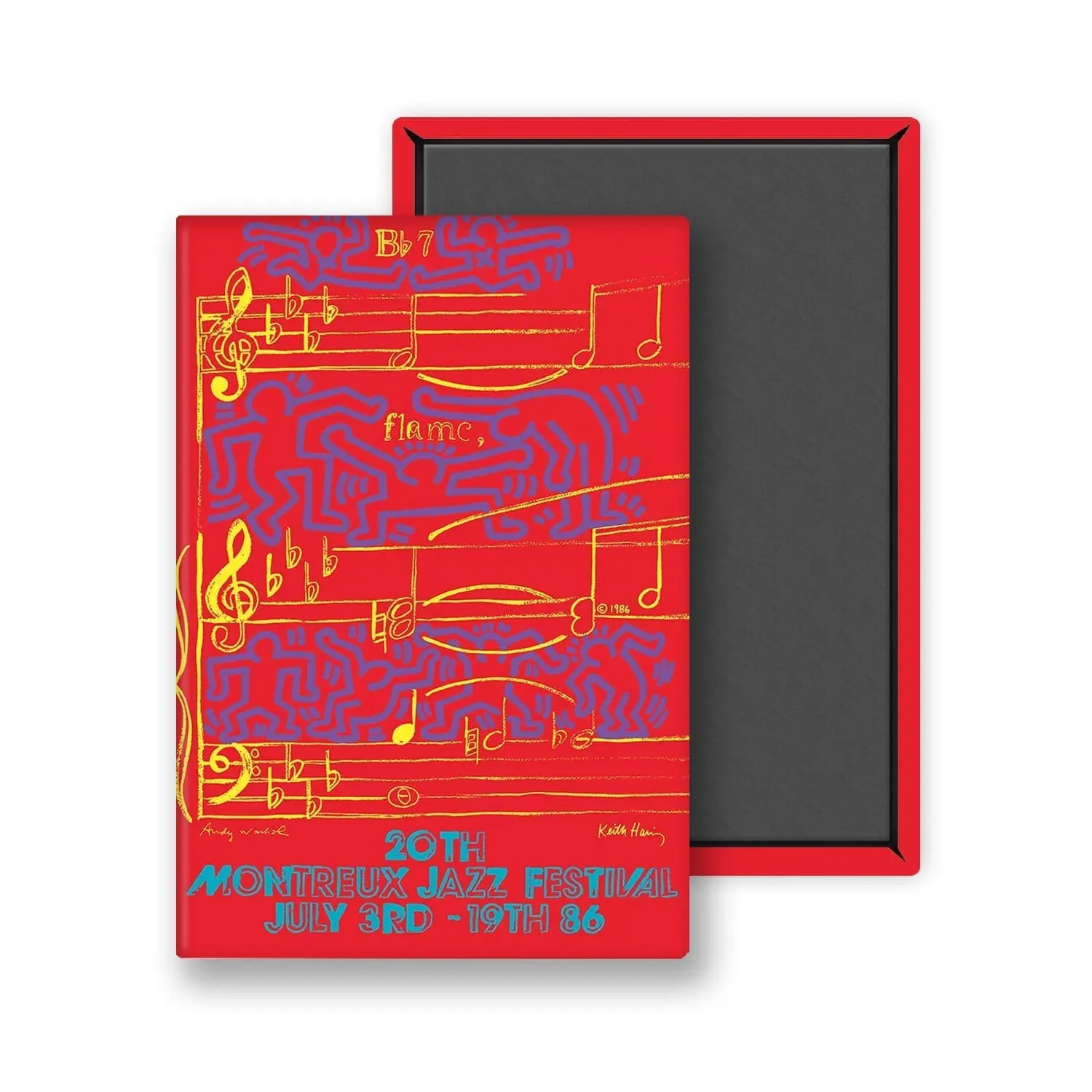 Ce magnet fait partie de la collection Keith Haring & Andy Warhol. Pour les vingt ans du Festival et les 50 ans de Claude Nobs, une affiche royale s’imposait. Pierre Keller y pourvoit en réunissant Keith Haring et Andy Warhol pour une première collaboration entre les deux stars newyorkaises. Les deux artistes décident de peindre l’affiche en rouge et jaune. «C’est une idée très suisse qui va rappeler le condiment Maggi», leur glisse Keller.