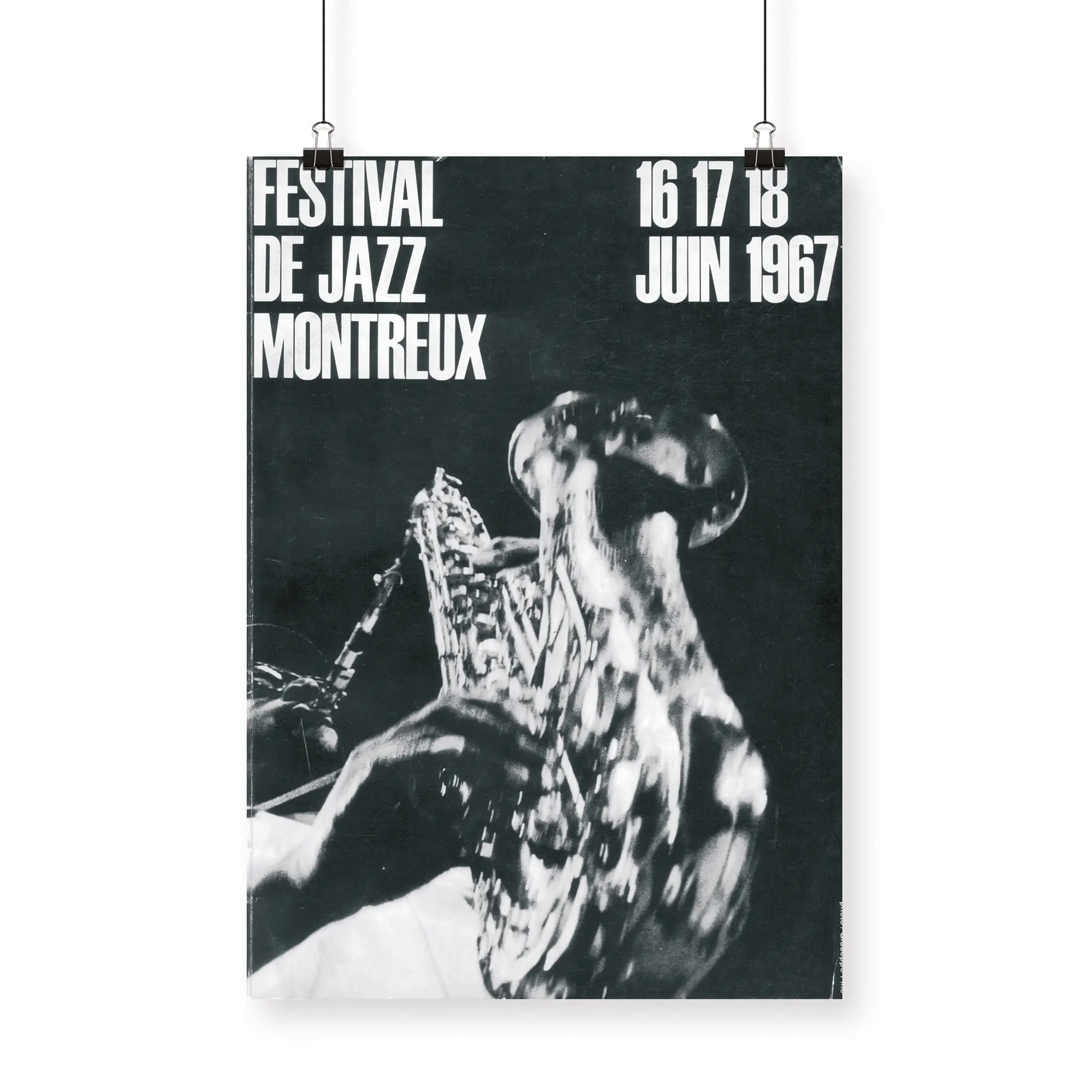 Ceci n’est pas une affiche. Du moins pas une affiche originale. La première édition du Festival n’avait pas pu se payer une grande campagne de communication avec son maigre budget initial. La photographie de couverture du programme s’est muée en poster de cette édition. L’image en contreplongée représente le saxophoniste Charles Lloyd, l’invité de marque de 1967. Elle est signée Guiseppe Pino.