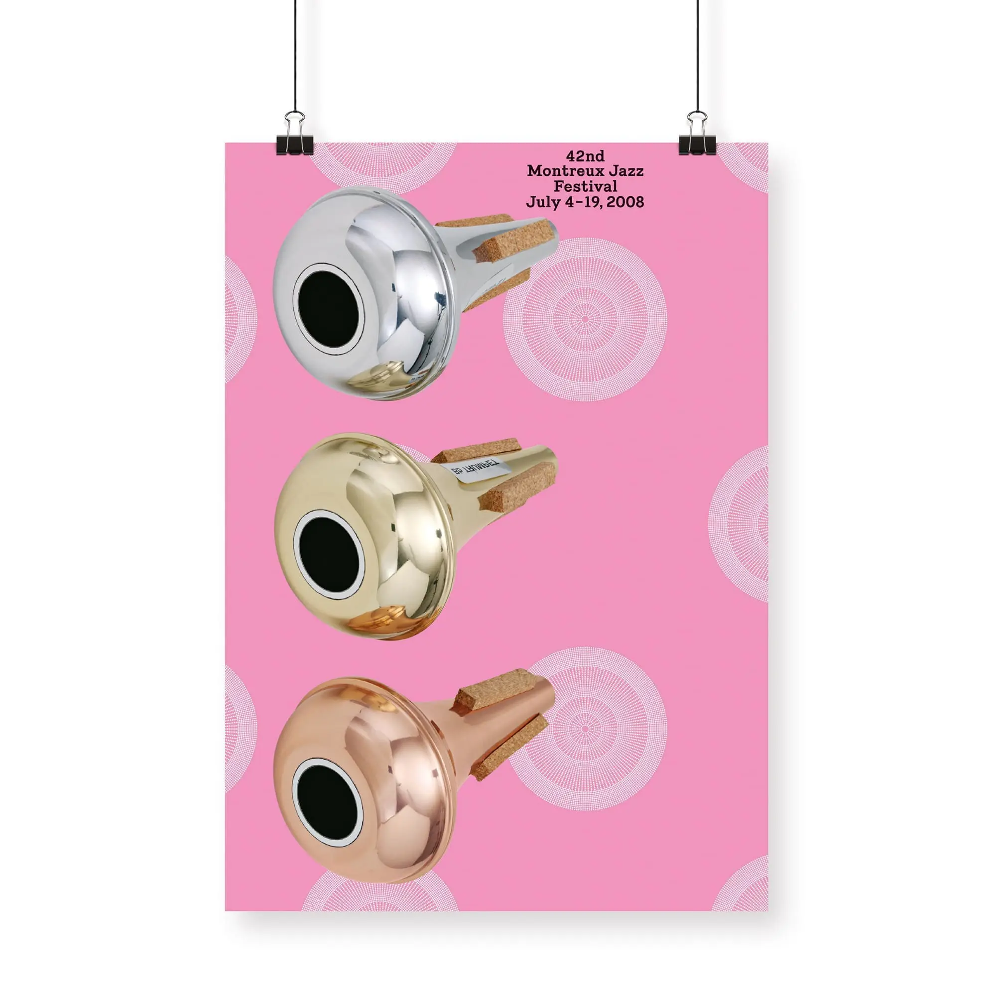 C’est une nouvelle fois une star internationale de l’art contemporain qui reçoit carte blanche pour concevoir l’affiche du festival. L’artiste genevois John M Armleder combine une composition graphique de type papier peint à motifs cinétiques avec la photo de trois sourdines à trompettes.
