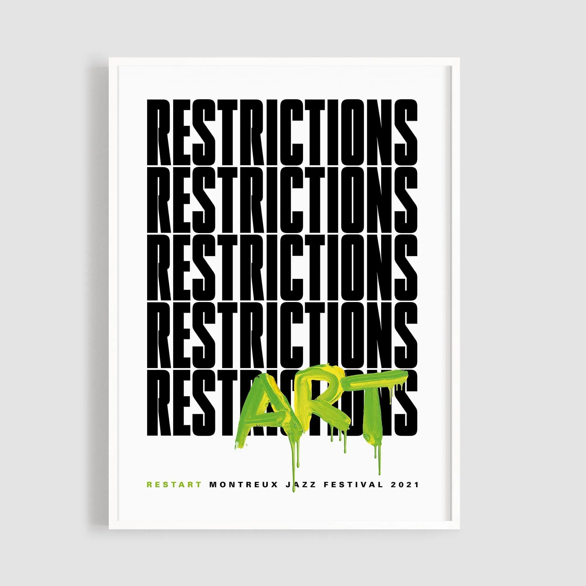 «RestART Ohne Kunst und Kultur wird’s still. Keine Konzerte, keine Theatervorstellungen, keine Kinobesuche und auch die Museen waren geschlossen. Mit diesem Plakat wollte ich das erwachen der Kunst in den Vordergrund stellen. Die « Einschränkungen » haben das Leben langweilig und starr werden lassen. Die Wiederholung des Wortes « Restrictions » in schwarzen Buchstaben erzeugt eine Schwere. Die Repetition des gleichen Wortes visualisiert die Eintönigkeit. Durchbrochen wird diese schwarze Wand durch die Kunst. Farbig, frech und locker poppt das Wort « Art » auf und so wird aus « Restrictions » « Restart » und aus « Restart » restart Art.». Joceline Strebel, graphiste, Suisse