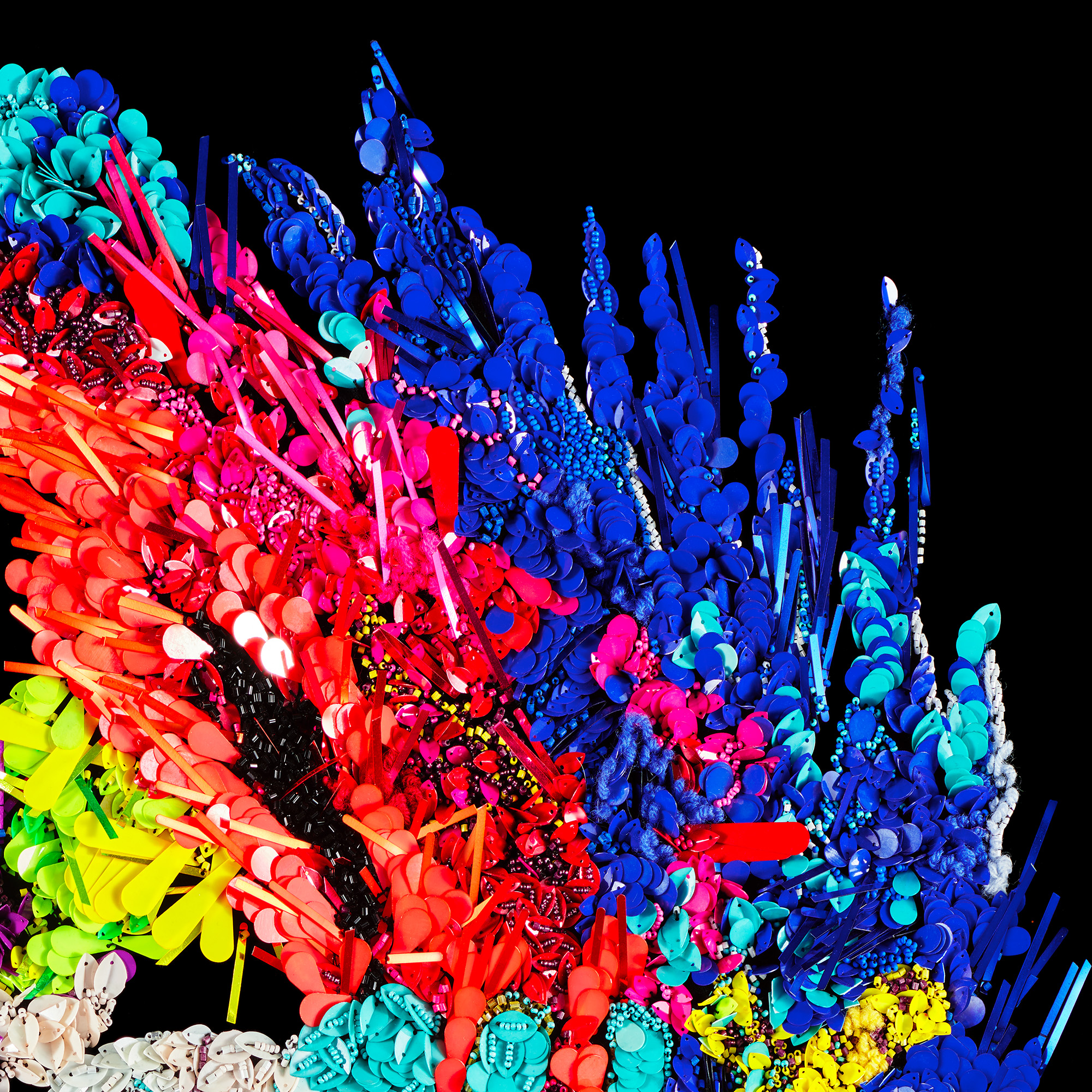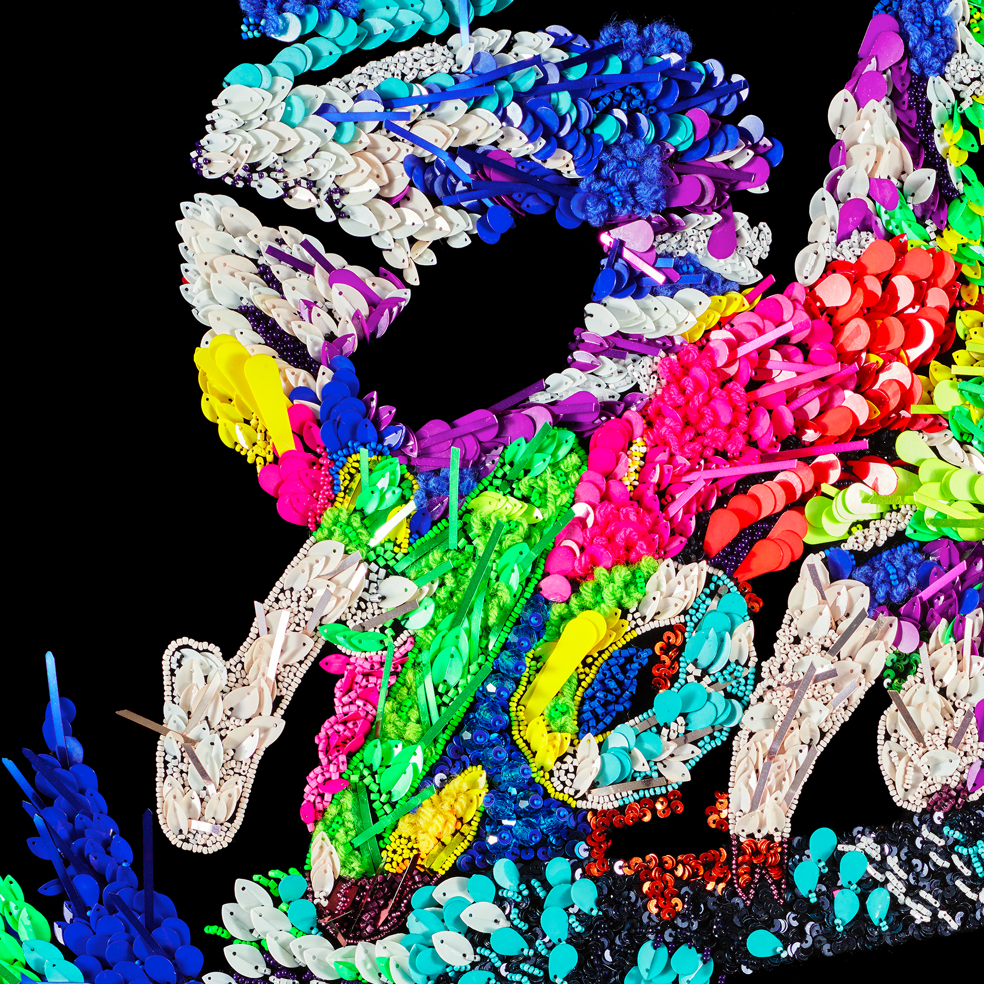Pour répondre au souhait de l’artiste de renforcer la vibration visuelle des paillettes, des encres fluorescentes ont été intégrées parmi les six couleurs utilisées. Sur un fond noir satiné, ces paillettes mates aux teintes intenses semblent flotter sur un plan distinct, créant une impression de profondeur et de dimensionnalité grâce au contraste de brillance.